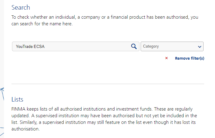 A Swiss broker should obtain a license from FINMA, which monitors the activities of brokerage companies in that country. However, a search in the registry of regulated organizations yielded nothing. YouTrade ECSA is not listed there.