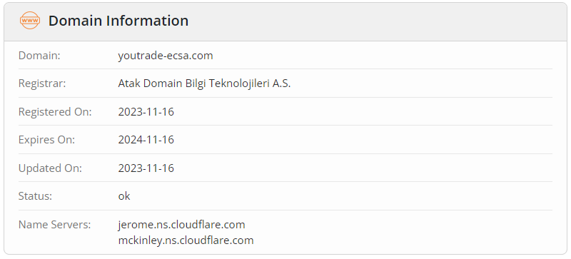 The organization appeared in 2017 and since then has allegedly gained the trust of 50,000 clients. However, there are no confirmations of this, and conversely, there are refutations. The number of reviews on the internet is too small for such many clients, and the domain of the official website was only registered on November 16, 2023. Therefore, it is very likely that YouTrade ECSA is deceiving about its launch date. Not only regarding its years of experience but also the number of users and other facts.